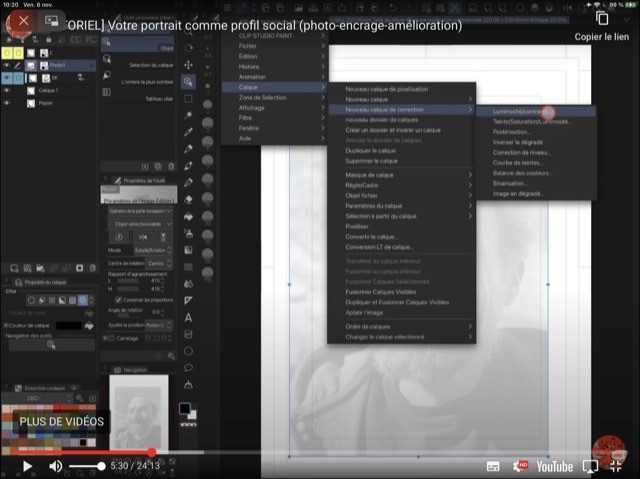 - Changer la photo en calque de couleur noir, puis ajouter par le [menu] > [nouveau calque] > [calque de correction] > [Luminosité / contraste]. Contrairement à la vidéo, réglez maintenant la luminosité contraste pour avoir du vrai noir en aplat, du vrai blanc en aplats et 1 ou 2 gammes de gris seulement.