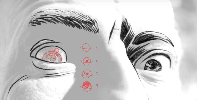 - TIPS : sans le portrait comme exemple, on commence plutôt par le tour de l’œil, puis placez la pupille pour diriger le regard, puis le reflet et enfin l’iris