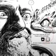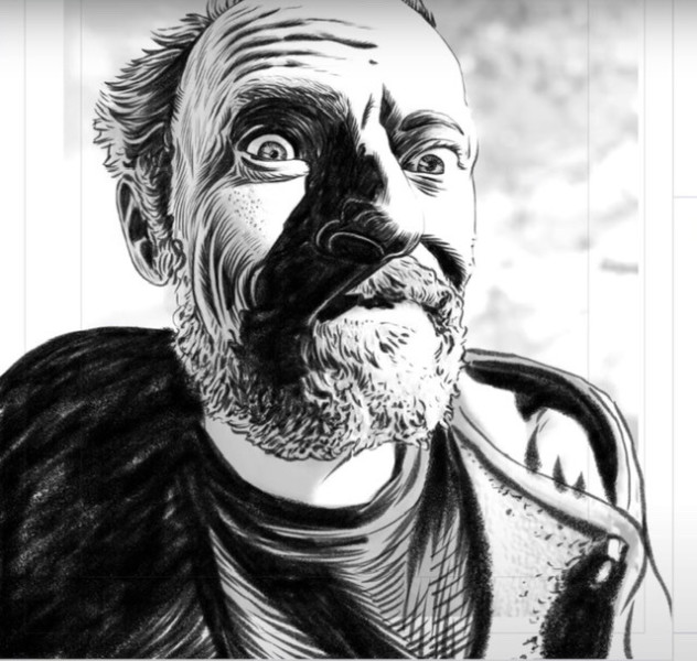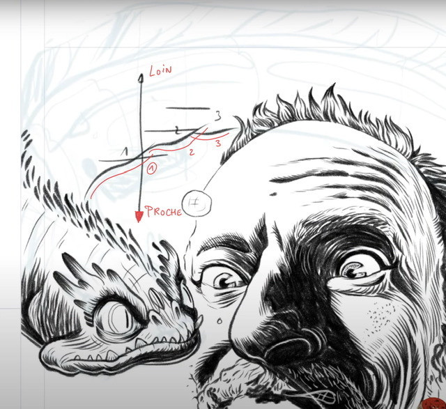 - Lâchez-vous : dupliquez votre portrait encré et verrouillez-le. Sur le calque dupliqué, modifiez tant que vous voulez la réalité de votre portrait : ajout d'une murène (ou de votre animal de compagnie préféré), d'un stylo (ou tout autre outil spécifique que vous utilisez personnellement), dans le même style que votre portrait encré. Gardez un peu de liberté d'encrage par rapport à votre croquis.