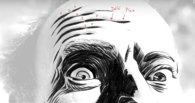 - Pour les textures, variez votre trait (taille, appui, longueur, courbe et rapprochement) en fonction de la texture que vous dessinez : peau, barbe, cheveux, vêtement. Devenez un cheveux, un poil de barbe, une ride et laissez votre poignet plus ou moins souple selon la texture