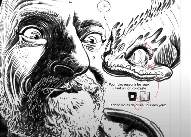 - Encrez : comprenez bien d'où vient la lumière et les ombres qu'elle projette : ombre portée, lumière réfléchie… Faites les aplats de noirs puis les petites langues de gris, ou d'abord les contours et remplissez ensuite les noirs. Pour les langues de gris, orientez-les par rapport à la lumière ou par rapport à la surface de votre volume (voyez le nez, les joues etc. en 3D)