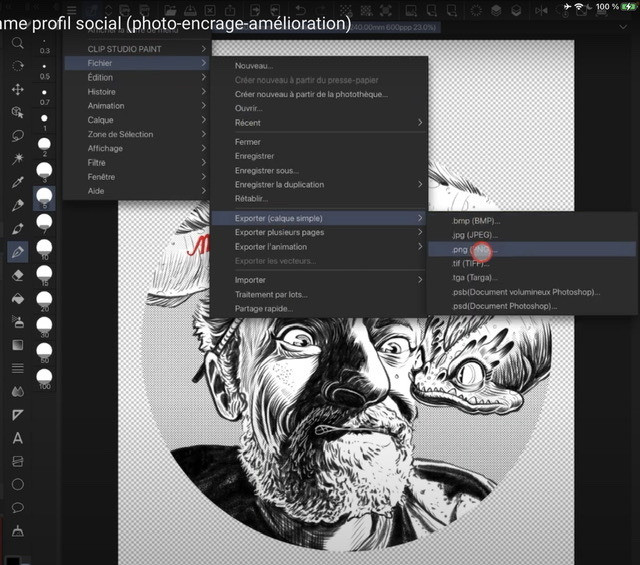 - Puis allez dans [menu] > [Fichier] > [Exporter (calque simple)] > [PNG] et exportez votre fichier en vérifiant bien le format carré (600px*600px, ou moins pour certains réseaux sociaux) et vérifiez bien que vous avez choisi [jusqu'à l'intérieur du trait de coupe] - Ajoutez votre pseudo, bien visible en petit format