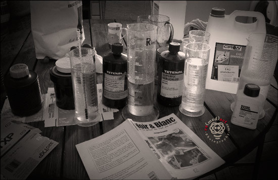 Éprouvette, bac et solutions pour développer des négatifs argentiques