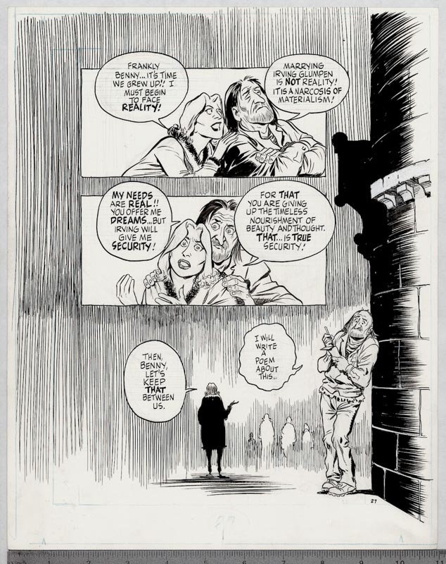 Ce que j'aime aussi chez Will Eisner, c'est qu'il travaillait majoritairement au pinceau, qui est aussi mon outil de prédilection. J'ai bien à la fois le fait que ses planches et illustrations restent assez clair, avec cependant une bonne gestion des noirs, sans que ça vire dans du glauque, mais aussi des gris, que ce soit en mode hachures, en mode grattage de papier texture, mais aussi en teinte de gris encre de Chine (ou aquarelle ?) à diverses dilutions.Une autre caractéristique est sa gestion des cases, qui, souvent, n'en sont pas, ce qui semble au final à la fois très aéré et très spécifique, comme la signature Eisner en quelque sorte.