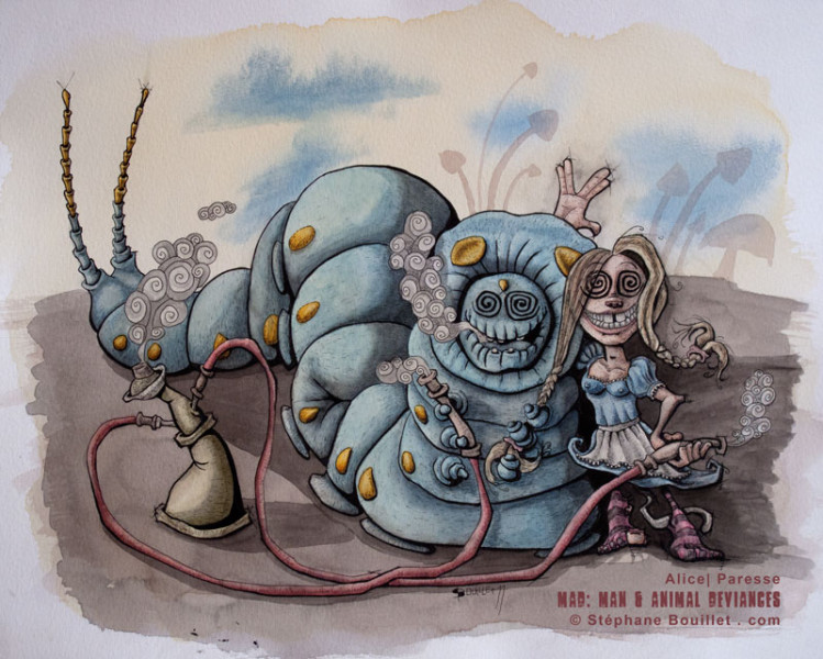 Les allusions aux drogues dans Alice au pays des merveilles y sont multiples : pilules de LSD proposées par le lapin, champignons hallucinogènes, ou opium fumé par la chenille, et auquel Alice succombe, avant de tomber dans la paresse. Les allusions aux autres personnages sont multiples : - le chat : sourire, queue, rayures des jambes, oreille, - lapin : Alice fait des oreilles de Lapin avec sa main, clin d'oeil également aux Envahisseurs, dents du bonheur, clin d'oeil à Vanessa Paradis, épouse de Johnny Deep dans le film de Tim Burton, où il arbore les mêmes dents, - la reine de coeur : avec la forme des tuyaux sortant du narghilé.