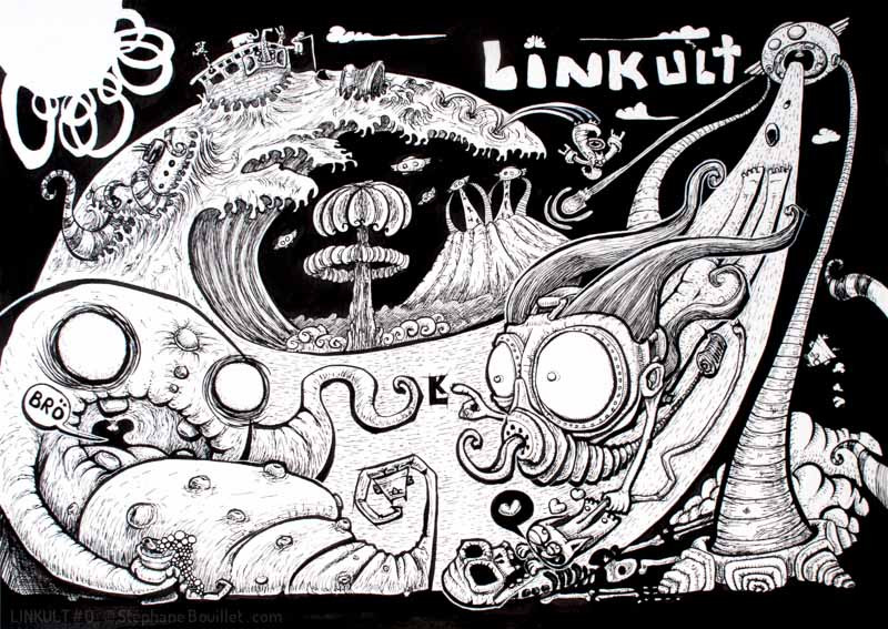 Couverture sur le thème de la fin du monde pour le premier numéro du fanzine d'Oloron Sainte Marie: Linkult. Cette couverture est un clin d'oeil à La Création d'Adam (Michel-Ange), mais inversée en quelque sorte dans la position de l'humain et de la divinité: • d'une part il s'agit d'une femme ici, et c'est elle qui vole et fait des efforts pour entrer en contact avec l'extra-terrestre • l'extra-terrestre, quant à lui, pourrait juste étendre sa tentacule pour entrer en contact, mais ne fait aucn d'effort. Il est par ailleurs déjà en proie aux vices humains, rotant une bière. En surpoids, il ne vole plus depuis bien longtemps. Les mascottes de Linkult, Mao le chat et Qi les piafs sont également présents. En outre, l'apocalypse est représentée par un tsunami, le retour de Jésus marchant sur l'eau, le déluge et l'arche de Noé, une invasion extra-terrestre, une guerre nucléraire, des monstres des profondeurs abyssales océaniques, des éruptions solaires, un météore tombant sur le mont Bugarach.