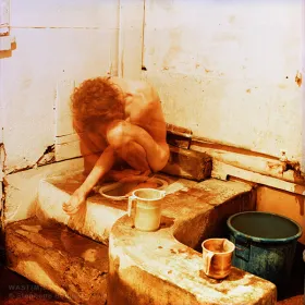 Masque Photographie Autoportrait de nu dans une ancienne usine industrielle désaffectée: homme nu accroupi et visage masqué, tenant un pistolet à peinture.