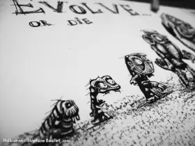 Evolve or die: évolution de l'homme depuis le mollusque jusqu'au zombie en passant par le chimpanzé, le gorille et l'homo sapiens armé d'un fusil, tuant le zombie, mais se faisant arracher le bras
