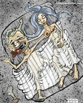 Réveil dans un lit avec une gueule de bois, au coté d'une femme nue, qui tape sa cigarette dans notre bouche dont de la bave sort. L'homme a les cheveux vert et la femme les cheveux bleus.