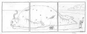 ILLUSTRATION : Planche de BD où Sencha se baigne nue dans une plante énorme, devant le pterus, sorte de baline volante, et Spynx, un chat sans poil, qui la regarde sortir de l'eau, avant qu'elle s'all