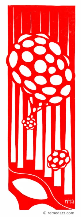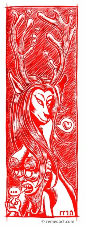 Manuel Pomar tient un mégaphone et crie et diffuse de l'art contemporain, symbolisé par des sorte de fantômes tortueux et colorés.