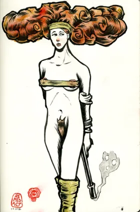 Dessin réalisé lors des sketch night à la Société des illustrateurs de New-York. Pauses de 20 minutes. Une femme nue à la chevelure ébouriffante tient un pistolet fumant