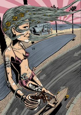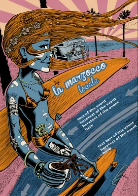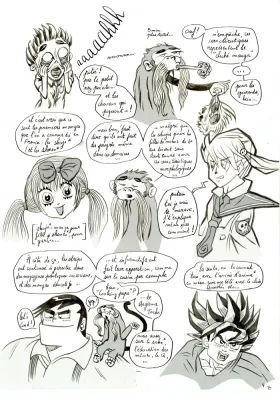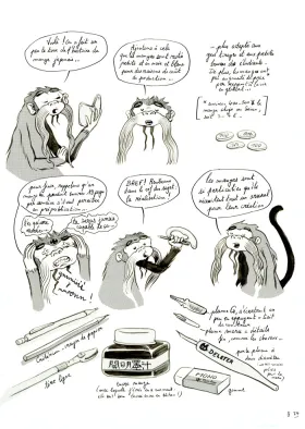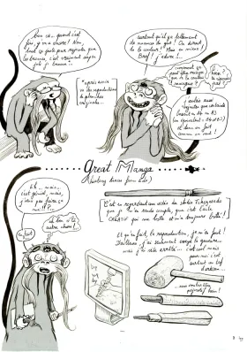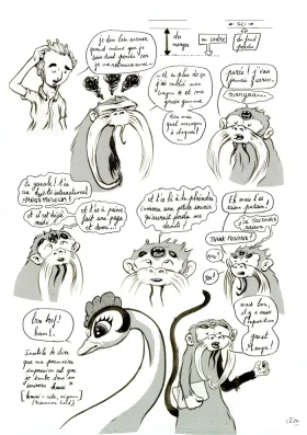 Un bar sur une plage distribue café, bière et pizza, devant un spot de surf océanique australienne. Sont présent un lio barman, une chatte, un ornithorynque et un koala.