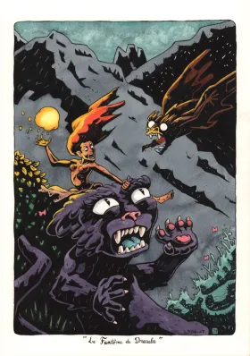 La sorcière chat et le Fantôme de Dracula Illustration Une sorcière chevauchant un chat est attaquée par le fantôme de Dracula métamorphosé en chauve-souris. et s'apprête à lui lancer une boule de feu.