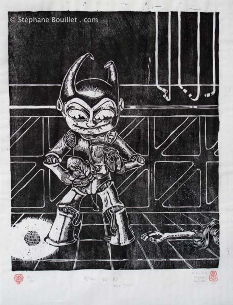 Par S. BOUILLET, 14 novembre, 2013 Publié dans Gravure Créé avec Gravure sur bois A2 (± 40 x 60 cm) Wenzhou Encre de Chine Astro remplace le fils décédé d'un savant, mais n'est qu'un robot... à moins que son envie de devenir humain prenne le dessus... Il a arraché le coeur de son géniteur scientifique et veut remplacer sa pile énergétique avec... Voir plus de 7 péchés capitaux Astro le petit robot Bois Coeur Encre blanche Envie Gravure Humain Héros Laboratoire Meurtre Papier japonais Robot Sang Science fiction Scientifique MAD: Man & Animal Deviances