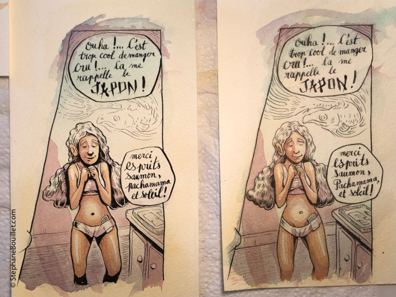 Je teste donc l'aquarelle, sur divers encrage, et c'est plein d'enseignements :