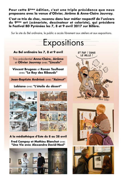 La 8ème édition du Festival BD Pyrénées 2017 aura lieu les 7, 8 et 9 avril. Le vendredi 7 est dédié aux scolaires, le samedi 8 et le dimanche 9 sont ouverts à tous : des plus petits aux plus grands !
