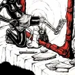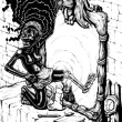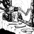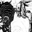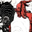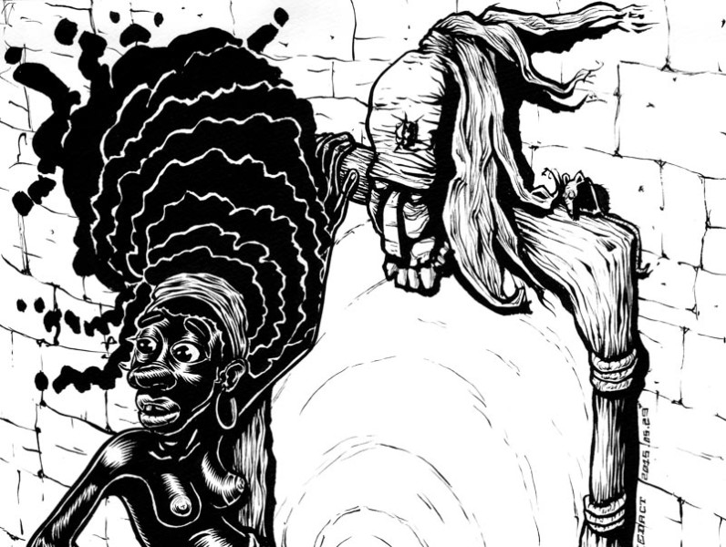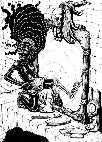 Black Alice traverse le miroir, laissant derrière elle son ancienne vie. Alice, petite fille esclave africaine, passe le pied à travers le miroir menant au pays des merveilles. Le pied d'Alice, de l'autre coté du miroir, est devenu blanc, transformé en squelette. La chatte blanche regarde son reflet noir. Le miroir, posé sur la cheminée, a une espèce de masque africain au dessus, avec une souris qui regarde la scène. Une pendule blanche en forme de lapin donne l'heure.