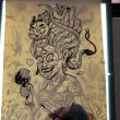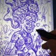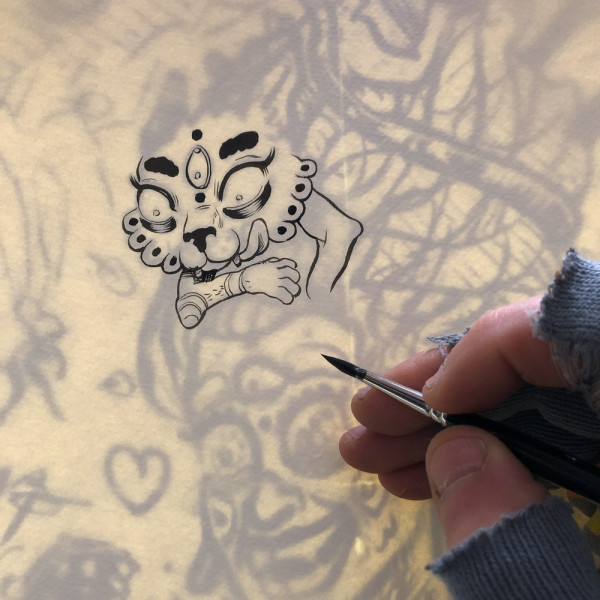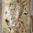 Des serpents lui sortent des cheveux entre deux baguettes chinoises.