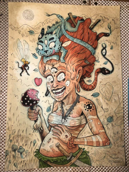 Une nuit de pleine lune, une jeune chamane aux dread locks rousses affublée d'un chat dans les cheveux, croque dans un champignon amanite tue-mouches et découvre les Mondes invisibles : trouble de la vision, vision extra lucide et en cinq dimensions etc. symbolisé par l'ouverture du troisième œil.