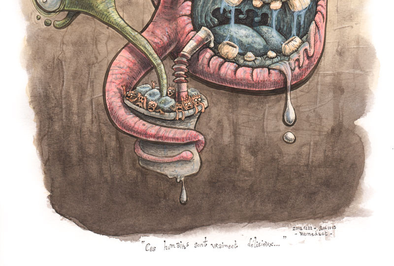 Il s'agit d'un dessin que j'avais encré pour une exposition spéciale fin du monde du 22 décembre 2012, et dont j'avais commencé l'aquarelle: j'avais seulement mis une couche de fond brune et une couche de base verte sur l'extra terrestre de gauche. Quatre ans après, je le ressort d'un tiroir et fini l'aquarelle, en recherchant du volume et du réalisme !