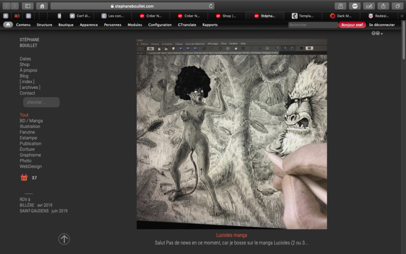 C'est donc avec un plaisir particulier que j'ai passé stephanebouillet.com en mode sombre, qui se met en place automatiquement via le CSS ci-dessus (adapté pour la forme) en fonction du thème de votre interface IOS Mojave. Les navigateurs qui supportent aujourd'hui ce CSS sont Safari… et c'est tout d'après quelques essais. Chrome et Firefox, même en les affublant des modes sombres ou système, ils n'ont su afficher que le mode clair pour mon site. En revanche, ils peuvent suivre, pour leur propre interface, le thème de Mojave (et windows à priori). Pour le voir, vous devez donc être sous MacOS Mojave en mode sombre… pour l'instant.