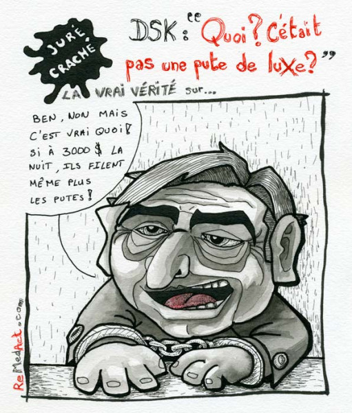 Par S. BOUILLET, 16 mai, 2011 Publié dans Dessin de presse DSK menotté lors de son interrogatoire par la police de New York: “Quoi ? C'était pas une pute de luxe ?” Voir plus de Dominique Strauss-Kahn