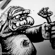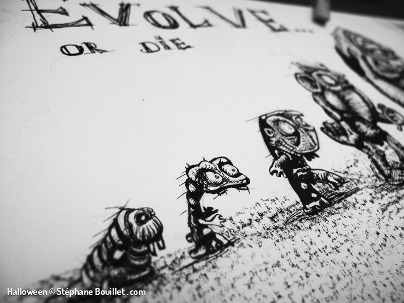 Par S. BOUILLET, 28 novembre, 2012 Publié dans Illustration Créé avec Encre de Chine Pinceau Papier Montval (300g/m2) A3 (± 30 x 42 cm) Evolve or die: évolution de l'homme depuis le mollusque jusqu'au zombie en passant par le chimpanzé, le gorille et l'homo sapiens armé d'un fusil, tuant le zombie, mais se faisant arracher le bras par le gorille. Voir plus de Arme Charles Darwin Chimpanzé Dailyshit Fusil Gorille Humain Mollusque Nudité Singe Zombie Evolution Halloween