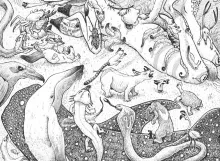 Les animaux sont : la déesse renard, marabout, sphinx à tête de mort, scarabée rhinocéros, grenouille kambo, barracuda, crocodile, hippopotame, scolopendre, libellule, étoile de mer, limace, singe nasique, vautour royal, chenille, cerf, koala, poulpe, tortue des Galapagos, manchot, rhinocéros, maki catta, blatte, loup, gecko, crabe, lièvre, castor, vipère, corbeau, megaptère, axolotl, requin baleine, murène, carangue, cobra royal, ours malais, rat, flamand rose, kiwi, chauve souris, tigre, tamanoir.