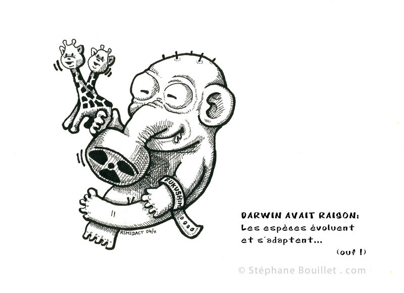 Heureusement pour les japonais et l'espèce humaine, les bébé s'adaptent au taux élevé de radioactivité nucléaire de Fukushima au Japon: Darwin avait raison ! Ainsi voit-on aparaitre des bébés avec masque à gaz intégré...