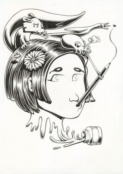Création graphique, aidée par des animaux sortis de l'imaginaire d'une femme graphiste, elle-même sortie d'un pot d'encre de Chine. Un écureuil donne naissance à un oiseau prêt à gober une mouche dessinée par le crayon que la graphiste a dans la bouche, tiré par une petite seiche. Une abeille citron s'approche de la fleur qu'a la graphiste dans les cheveux.