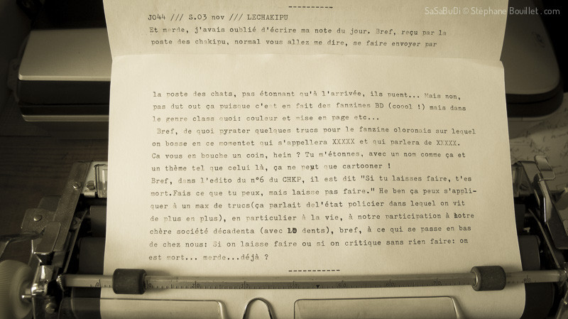 Et merde, j'avais oublié d'écrire ma note du jour. Bref, reçu par la poste des chakipu, normal ous allez me dire, se faire envoyer par la poste des chats, pas étonnant qu'à l'arrivée ils puent... Mais non, pas du tout ça puisque c'est en fait des fanzines BD (coool !) mais dans le genre class quoi: couleur et mise en page etc...