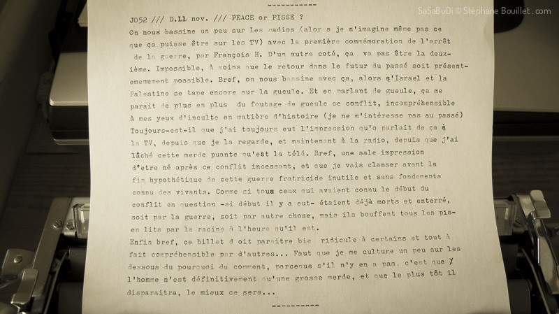 On nous bassine un peu sur les radios (alors je n'imagine même pas ce que ça puisse être sur les TV) avec la première commémoration de l'arrêt de la guerre, par François H. D'un autre coté, ça va pas être la deuxième. Impossible, à moins que le retour dans le futur du passé soit présentement possible. Bref, on nous bassine avec ça alors qu'Israël et la Palestine se tape encore sur la gueule. Et en parlant de gueule, ça me parait de plus en plus du foutage de gueule ce conflit, incompréhensible à mes yeux d'inculte en matière d'histoire (je ne m'intéresse ppas au passé). Toujours est-il que j'ai toujours eut l'impression qu'on parlait de ça à la TV, depuis que je la regarde, et maintenant à la radio, depuis que j'ai lâché cette merde puante qu'est la télé. Bref, une sale impression d'être né après ce conflit incessant, et que je vais clamser avant la fin hypothétique de cette guerre fratricide inutile et sans fondements connu des vivants. Comme si tous ceux qui avaient connu le début du conflit en question -si début il y a eu- étaient déjà morts et enterrés, soit par la guerre, soit par autre chose, mais ils bouffent tous les pis-en lits par la racine à l'heure qu'il est.