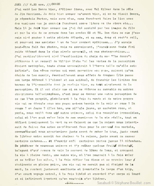 J'ai maté Les Doors hier, d'Oliver Stone, avec Val Kilmer dans le rôle de Jim Morrison. Je dois bien avouer qu'avant hier, si on me disait Doors, je répondais Portes, mais sans plus, sans forcément faire le lien avec des musiques que je connais forcément comme Riders on the storm etc... Mais là je dois bien avouer que j'ai été scotché par les images du film et par la vie de ce groupe dans les années 60 et 70. Bon dieu ce que j'aurais aimé gouter à cette période délurée, et au sex, drug et rock'n roll, et pourquoi pas assister à un de leurs concerts mythiques... J'y aurais peut-être fait des photos, mais me connaissant, j'aurais sans doute fini raide défoncé dans le plus simple appareil, et pas photographique... J'ai particulièrement aimé l'explication du choix du nom "The doors": référence à un recueil de William Blake "si les portes de la perception étaient nettoyées, toute chose apparaitrait à l'homme telle qu'elle est: infinie". Ces mêmes portes qui vont permettre -ou pas-, suivant qu'on décide de les ouvrir, éventuellement sous effets de drogues (Jim passe son temps défoncé à l'alcool et aux acides), de franchir les limites des bornes de l"impossible dont je parlais hier, ou tout simplement de la perception. Et il est clair que si on se défonce au cannabis ou autres champignons hallucinogènes, c'est pour se donner une autre perception de ce que l'on perçoit, globalement à la fois du monde et de notre propre vie qui se déroule sous nos yeux: a-t-on besoin de la voir en rose ? En rouge ? en jaune ? Allez hop, une pillule jaune, un cacheton rose, et yopla, nous voilà dans un autre univers, celui des possibles impossibles, celui où l'on peut voler loin de ses angoisses de la vie réelle, tout en défiant ironiquement la mort ou en faisant ce que la raison nous interdisait de faire: des actes complètement fous pour le commun des mortels, commun auquel nous appartenions juste avant de gober le truc, juste avant de libérer notre esprit des chaînes de la raison, juste avant de casser certains cadenas... et d'ouvrir enfin certaines portes jusque là défendues. De pénétrer de nouveaux univers et d'y goûter quelque fruit défendu, balayant d'un revers de main le serpent de 10kms de long, et croquant -la vie à pleines dents, une autre vie, où l'on pourrait à la fois voler et se brûler les ailes, à la fois défier les dieux et se prendre leurs châtiments en pleine poire, une vie qui ne serait pas si éloignée de la mort, la rendant justement exaltante et immortelle le temps d'un trip, d'un court voyage astral, à la fois libéré et encombré d'un corps si lourd et si infiniment impotent qu'on voudrait s'en libérer.