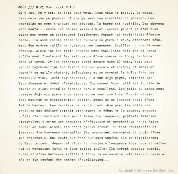 Ca y est. On y est. ça fait deux mois. Deux mois de photos. De notes. Deux mois que ça pousse. Et que ça veut pas s'arrêter de pousser. Les sourcils ne sont toujours pas adultes, la barbe est juvénile, les cheveux sont neufs... comme des nouveaux-nés d'hier, encore gluants et d'un bleu outre mer comme un schtroumpf fraichement écrasé qui reviendrait d'outre tombe. Ils sont raides comme des piquets au garde à vous, attendant bêtement des ordres qu'ils ne jugeront pas insensés, inutiles ou complètement débiles. Alors que les poils de barbe sont vacillants mais pas si lents qu'ils sont finalement les vainqueurs d'une course de long, de tenue dans le temps. On les donnerait vingt coeurs dans 10 mois, mais leur esprit psychédélique les feront onduler encore et encore, et vaciller jusqu'à ce qu'ils chutent, trébuchant et se prenant le bulbe dans une bouteille vide. Quant aux sourcils, ils ont déjà gagné, brillant par leur absence en début d'expérience. Ils savent bien qu'il est inutile de courir et c'est dans la lenteur qu'ils excellent. Les poils du torse sont presque déjà six pieds sous terre et ne sont pas loin d'avoir atteint leur maximum de participation active, avant de se laisser choir d'une faible hauteur. Les derniers ne participent même pas: les poils des oreilles ont déclaré forfait bien avant le début de la course, arguant qu'ils n'arriveraient même pas à faire une longueur, prétexte falacieux dissimulant à peine une angoisse héréditaire et psychotique de se faire couper en deux. Ainsi, ils n'ont jamais grandi, restant analphabêtes et ignorant des hauteurs auxquelles ils pourraient escompter et jouir d'une vue imprenable. Nul doute que dans quelques années, ils se réveilleront de leur torpeur, dépassant alors de plusieurs longueurs tous ceux et celles qui se moquaient jadis de leur petite taille. Ils seront devenus grands, rudes et d'une noirceur reflétant toute la mélancolie maladivement renfermée en eux pendant des an