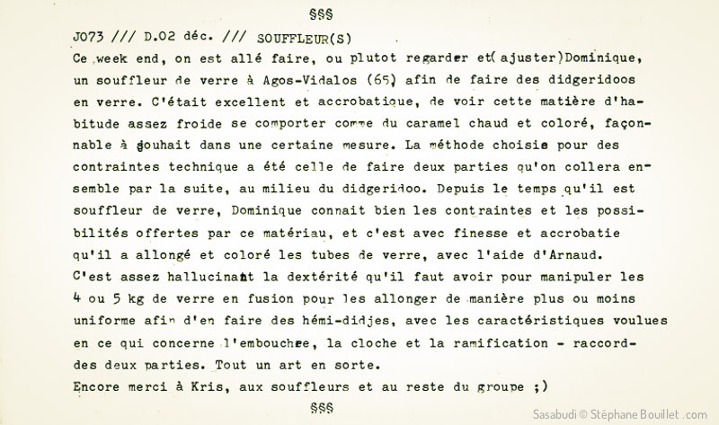 Ce week end, on est allé faire, ou plutôt regarder (et ajuster) Dominique, un souffleur de verre à Agos-Vidalos (65) afin de faire des didgeridoos en verre. C'était excellent et accrobatique, de voir cette matière d'habitude assez froide se comporter comme du caramel chaud et coloré, façonnable à souhait dans une certaine mesure. La méthode choisie pour des contraintes techniques a été celle de faire deux parties qu'on collera ensemble par la suite, au milieu du didgeridoo. Depuis 1e temps qu'il est souffleur de verre, Dominique connait bien les contraintes et les possibilités offertes par ce matériau, et c'est avec finesse et accrobatie qu'il a allongé et coloré les tubes de verre, avec l'aide d'Arnaud. C'est assez hallucinant la dextérité qu'il faut avoir pour manipuler les 4 ou 5 kg de verre en fusion pour les allonger de manière plus ou moins uniforme afin d'en faire des hémi-didjes, avec les caractéristiques voulues en ce qui concerne l'embouchee, la cloche et la ramification -raccord des deux parties. Tout un art en sorte.