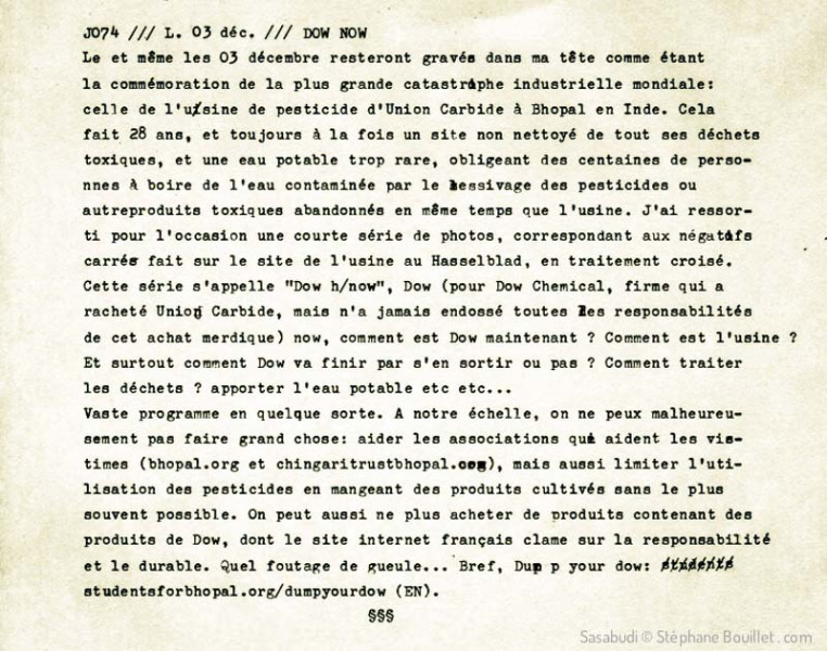 Le et même les 03 décembre resteront gravée dans ma tête comme étant la commémoration de la plus grande catastrophe industrielle mondiale: celle de l'usine de pesticide d'Union Carbide à Bhopal en Inde. Cela fait 28 ans, et toujours à la fois un site non nettoyé de tous ses déchets toxiques, et une eau potable trop rare, obligeant des centaines de personnes à boire de l'eau contaminée par le lessivage des pesticides ou autres produits toxiques arrandonnés en même temps que l'usine. J'ai ressorti pour l'occasion une courte série de photos, correspondant aux négatifs carré fait sur le site de l'usine au Hasselblad, en traitement croisé. Cette série s'appelle "Dow h/now", Dow (pour Dow Chemical, firme qui a racheté Union Carbide, mais n'a jamais endossé toutes les responsabilités de cet achat merdique) now, comment est Dow maintenant ? Comment est l'usine ? Et surtout comment Dow va finir par s'en sortir ou pas ? Comment traiter les déchets ? apporter l'eau potable etc etc... Vaste programme en quelque sorte. A notre échelle, on ne peut malheureusement pas faire grand chose: aider les associations qui aident les victimes (bhopal.org et chingaritrustbhopal.com), mais aussi limiter l'utilisation des pesticides en mangeant des produits cultivés sans, le plus souvent possible. On peut aussi ne plus acheter de produits contenant des produits de Dow, dont le site internet français clame sur la responsabilité et le durable. Quel foutage de gueule... Bref, Dump your dow: studentsforbhopal.org/dumpyourdow (EN).