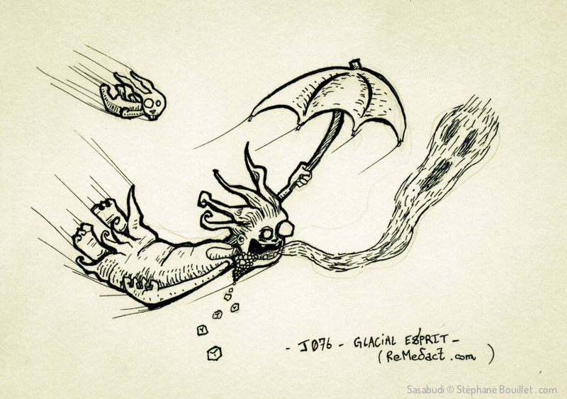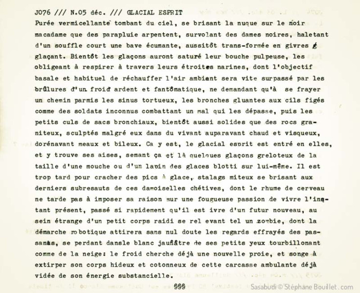 Purée vermicellante tombant du ciel, se brisant la nuque sur le noir macadame que des parapluies arpentent, survolant des dames noires, haletant d'un souffle court une bave écumante, aussitôt transformée en givres, glaçant. Bientcôt les glaçons auront saturé leur bouche pulpeuse, les obligeant à respirer à travers leurs étroites narines, dont l'objectif basale et habituel de réchauffer l'air ambiant sera vite surpassé par les brûlures d'un froid ardent et fantômatique, ne demandant qu'à se frayer un chemin parmis les sinus tortueux, les bronches gluantes aux cils figés comme des soldats inconnus combattant un mal qui les dépasse, puis les petits culs de sacs bronchiaux, bientôt aussi solides que des rocs graniteux, sculptés malgré eux dans du vivant auparavant chaud et visqueux, dorénavant meaux et bileux. Ca y est, le glacial esprit est entré en elles, et y trouve ses aises, semant ça et là quelques glaçons greloteux de la taille d'une mouche ou d'un lapin des glaces blotti sur lui-même. Il est trop tard pour cracher des pics à glace, stalags miteux se brisant aux derniers subresauts de ces damoiselles chétives, dont le rhume de cerveau ne tarde pas à imposer sa raison sur une fougueuse passion de vivre l'instant présent, passé si rapidement qu'il est ivre d'un futur nouveau, au sein étrange d'un petit corps raidi se relevant tel un zombie, dont la démarche robotique attirera sans nul doute les regards effrayés des passants, se perdant dans le blanc jaunâtre de ses petits yeux tourbillonant comme de la neige: le froid cherche déjà une nouvelle proie, et songe à extirper son corps hideux et cotonneux de cette carcasse ambulante déjà vidée de son énergie substancielle.