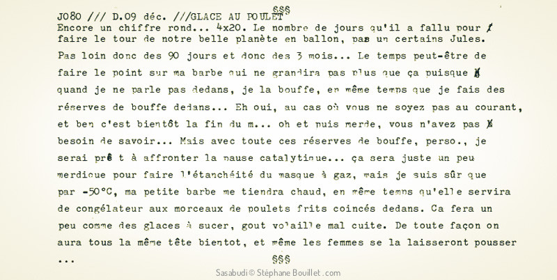 Encore un chiffre rond... 4x20. Le nombre de jours qu'il a fallu pour faire le tour de notre belle planète en ballon, par un certain Jules. Pas loin donc des 90 jours et donc des 3 mois... Le temps peut-être de faire le point sur ma barbe qui ne grandira pas plus que ça puisque quand je ne parle pas dedans, je la bouffe, en même temps que je fais des réserves de bouffe dedans... Eh oui, au cas où vous ne soyez pas au courant, et ben c'est bientôt la fin du m... oh et puis merde, vous n'avez pas besoin de savoir... Mais avec toutes ces réserves de bouffe, perso., je serai prêt à affronter la pause catalytique... ça sera juste un peu merdique pour faire l'étanchéité du masque à gaz, mais je suis sûr que par -50°C, ma petite barbe me tiendra chaud, en même temps qu'elle servira de congélateur aux morceaux de poulets frits coincés dedans. Ca fera un peu comme des glaces à sucer, goût volaille mal cuite. De toute façon on aura tous la même tête bientot, et même les femmes se la laisseront pousser...