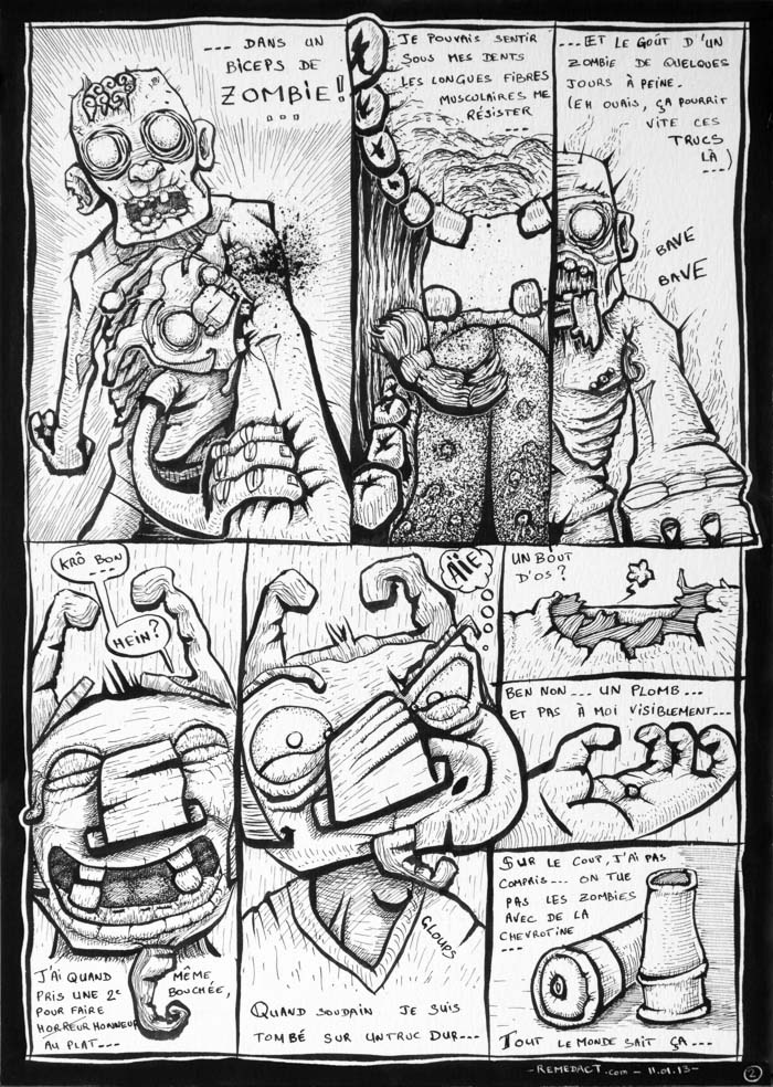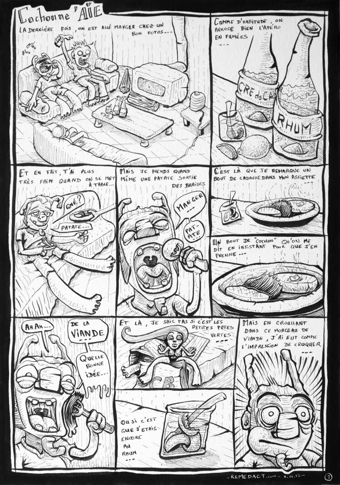 La dernière fois, je suis allé manger chez un pote. Comme d'habitude, on arrose bien l'apéro, et en fait à l'heure de manger vraiment, je n'ai plus très faim, mais je me prends quand même une patate sottie des braises. Je ne sais plus trop si c'est du aux tit'putes qu'on s'est envoyées avant, imbibées de rhum, ou si c'est le fait d'avoir bossé sur des zombies dernièrement, mais en croquant dans ce qu'on m'avait dit être du"cochon", j'ai eut l'impression de croquer un morceau de biceps de zombie... Je pouvais sentir sous mes dents à la fois les longues fibres musculaires résister un peu, et le goût d'un zombie de quelques jours (eh ouais, ça pourrit vite, ces trucs là). J'ai quand même pris une deuxième bouchée, histoire de pas mourrir idiot, et de faire honneur -et non pas horreur- au bout de cochon sauvage que l'on avait mis dans mon assiette. Quand soudain, je suis tombé sur un bout que j'ai tout d'abord cru être de l'os. En le recrachant, j'ai bien remarqué que c'était plus lourd et sa forme arrondi confirmait que ce n'était autre chose qu'un plomb... Mais on m'a quand même confirmé que dans le cochon, tout est bon, sauvage ou pas...
