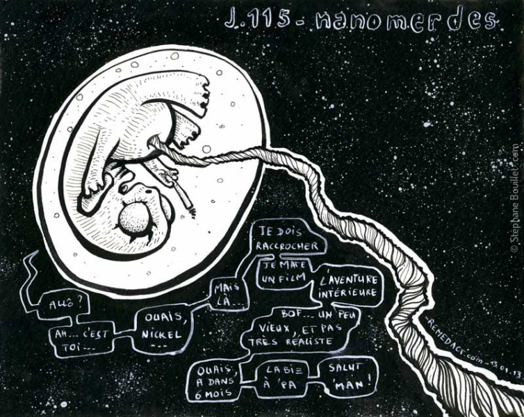 Elles sont là. Déjà là. Partout. Elles pénètrent nos cellules et nous intègrent des Cellphones... Avant même la naissance. Et non, ce n'est pas de la science-fiction. Des chercheurs ont réussi à greffer un téléphone portable à un foetus de 3 mois et 1/2, et ses parents peuvent donc déjà lui passer un coup de fil. Coup de maître ? Non, et oui à la fois. Les nanotechnologies sont les dieux -ou déesses- de demain. Injectées en intraveineuse à la mère, elles ont réussi à passer la barrière placentaire, à trouver les cellules cibles -auditives et cérébrales- et à construire in situ une merveille de technologie: un téléphone dernier cri, entièrement intégré au cerveau et aux oreilles. Eh ouais ! Aux DEUX oreilles, permettant aux futur bébé d'écouter également de la musique en stéréo, et même de regarder des films, puisque le signal est directement projeté sur la rétine grâce à un micro (et même nano) projecteur intégré à coté du cristallin. Il suffit de fermer les yeux, de penser au film voulu, au volume et à la langue, et c'est parti ! Les lobbies du tabac voulaient même greffer des mini-doses de nicotine sous forme de cellules qui se "suicideraient" (apoptose) si un stress était perçu dans le sang, mais les organismes de santé ont refusé, arguant qu'il suffisait que la mère fume normalement pour défoncer le foetus. Mais les lobbies tabagiques ont fait appel... Affaire à suivre...