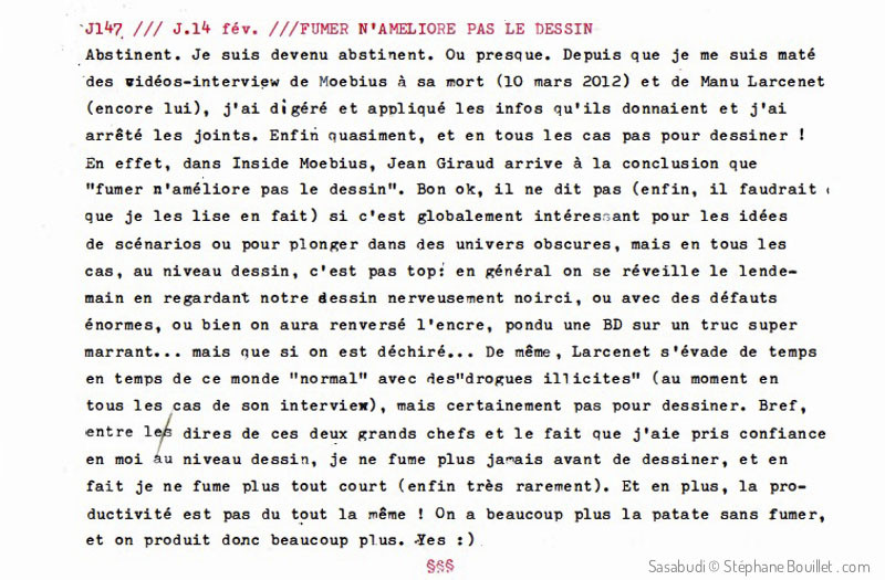 Abstinent. Je suis devenu abstinent. Ou presque. Depuis que je me suis maté des vidéos-interviews de Moebius à sa mort (10 mars 2012) et de Manu Larcenet (encore lui), j'ai digéré et appliqué les infos qu'ils donnaient et j'ai arrêté les joints. Enfin quasiment, et en tous les cas pas pour dessiner En effet, dans Inside Moebius, Jean Giraud arrive à la conclusion que "fumer n'améliore pas le dessin". Bon ok, il ne dit pas (enfin, il faudrait que je les lise en fait) si c'est globalement intéressant pour les idées de scénarios ou pour plonger dans des univers obscures, mais en tous les cas, au niveau dessin, c'est pas top ! En général on se réveille le lendemain en regardant notre dessin nerveusement noirci, ou avec des défauts énormes, ou bien on aura renversé l'encre, pondu une BD sur un truc super marrant... mais que si on est déchiré... De même, Larcenet s'évade de temps en temps de ce monde normal avec des "drogues illicites" (au moment en tous les cas de son interview), mais certainement pas pour dessiner. Bref, entre les dires de ces deux grands chefs et le fait que j'aie pris confiance en moi au niveau dessin, je ne fume plus jamais avant de dessiner, et en fait je ne fume plus tout court (enfin très rarement). Et en plus, la productivité est pas du tout la même ! On a beaucoup plus la patate sans fumer, et on produit donc beaucoup plus. Yes :)