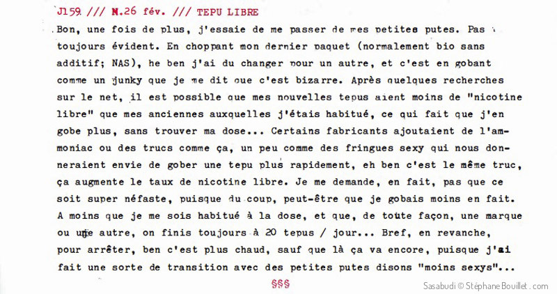 Bon, une fois de plus, j'essaie de me passer de mes petites putes. Pas toujours évident. En choppant mon dernier paquet (normalement bio sans additif; NAS*), he ben j'ai du changer pour un autre**, et c'est en gobant comme un junky que je me dit que c'est bizarre. Après quelques recherches sur le net, il est possible que mes nouvelles tepus aient moins de "nicotine libre" que mes anciennes auxquelles j'étais habitué, ce qui fait que j'en gobe plus, sans trouver ma dose... Certains fabricants ajoutaient de l'ammoniac ou des trucs comme ça; un peu comme des fringues sexy qui nous donneraient envie de gober une tepu plus rapidement, eh ben c'est le même truc, ça augmente le taux de nicotine libre. Je me demande, en fait, pas que ce soit super néfaste, puisque du coup, peut-être que je gobais moins en fait. A moins que je me sois habitué à la dose, et que, de toute façon, une marque ou ume autre, on finis toujours à 20 tepus / jour... Bref, en revanche, pour arrêter, ben c'est plus chaud, sauf que là ça va encore, puisque j'ai fait une sorte de transition avec des petites putes disons "moins sexys"... * Natural American Spirit ** Pueblo