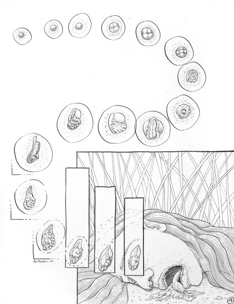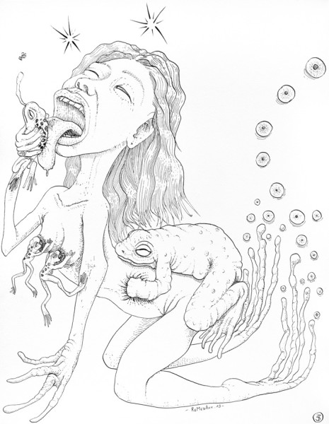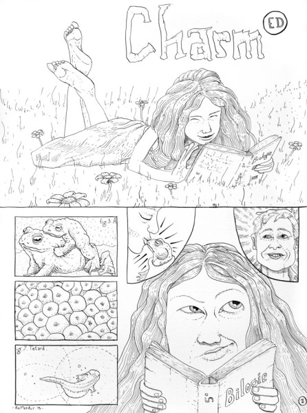 ILLUSTRATION : Bande dessinées en 4 planches sur les péripéties et délires sexuels d'une jeune fille et de crapauds hallucinogènes.