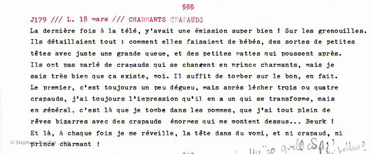 TEXTE : La dernière fois à la télé, y'avait une émission super bien ! Sur les grenouilles. Ils détaillaient tout : comment elles faisaient des bébés, des sortes de petites têtes avec juste une grande queue, et des petites pattes qui poussent après. Ils ont pas parlé de crapauds qui se changent en princes charmants, mais je sais très bien que ça existe, moi. Il suffit de tomber sur le bon, en fait. Le premier, c'est toujours un peu dégueu, mais après avoir léché trois ou quatre crapauds, j'ai toujours l'impression qu'il y en a un qui se transfonme, mais en général, c'est là que je tombe dans les pommes, que j'ai tout plein de rêves bizarres avec des crapauds énormes qui me montent dessus... Beurk ! Et là, à chaque fois je me réveille, la tête dans du vomi, et ni crapaud, ni prince charmant !