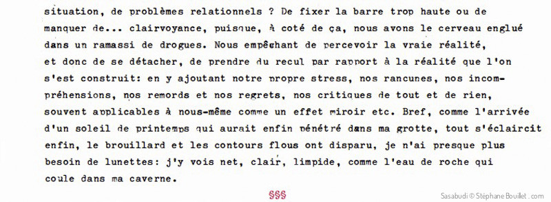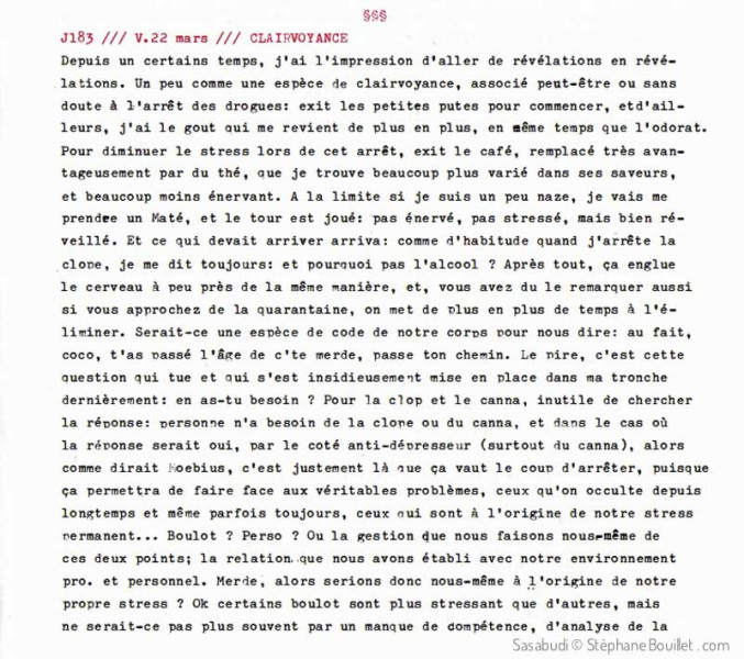 Depuis un certains temps, j'ai l'impression d'aller de révélations en révélations. Un peu comme une espèce de clairvoyance, associé peut-être ou sans doute à l'arrêt des drogues: exit les petites putes pour commencer, et d'ailleurs, j'ai le goût qui me revient de plus en plus, en même temps que l'odorat. Pour diminuer le stress lors de cet arrêt, exit le café, remplacé très avantageusement par du thé, que je trouve beaucoup plus varié dans ses saveurs, et beaucoup moins énervant. À la limite si je suis un peu naze, je vais me prendre un Maté, et le tour est joué: pas énervé, pas stressé, mais bien réveillé. Et ce qui devait arriver arriva: comme d'habitude quand j'arrête la clope, je me dis toujours : et pourquoi pas l'alcool ? Après tout, ça englue le cerveau à peu près de la même manière, et, vous avez dû le remarquer aussi si vous approchez de la quarantaine, on met de plus en plus de temps à l'éliminer. Serait-ce une espèce de code de notre corps pour nous dire: "au fait, coco, t'as passé l'âge de c'te merde, passe ton chemin" ? Le pire, c'est cette question qui tue et qui s'est insidieusement mise en place dans ma tronche dernièrement: en as-tu besoin ? Pour la clope et le canna, inutile de chercher la réponse: personne n'a besoin de la clope ou du canna, et dans le cas où la réponse serait oui, par le coté anti-dépresseur (surtout du canna), alors comme dirait Moebius, c'est justement là que ça vaut le coup d'arrêter, puisque ça permettra de faire face aux véritables problèmes, ceux qu'on occulte depuis longtemps et même parfois toujours, ceux oui sont à l'origine de notre stress permanent... Boulot ? Perso ? Ou la gestion que nous faisons nous-mêmes de ces deux points; la relation que nous avons établie avec notre environnement pro. et personnel. M