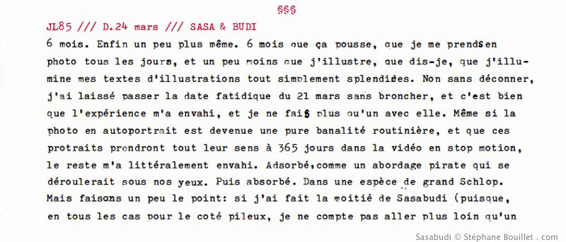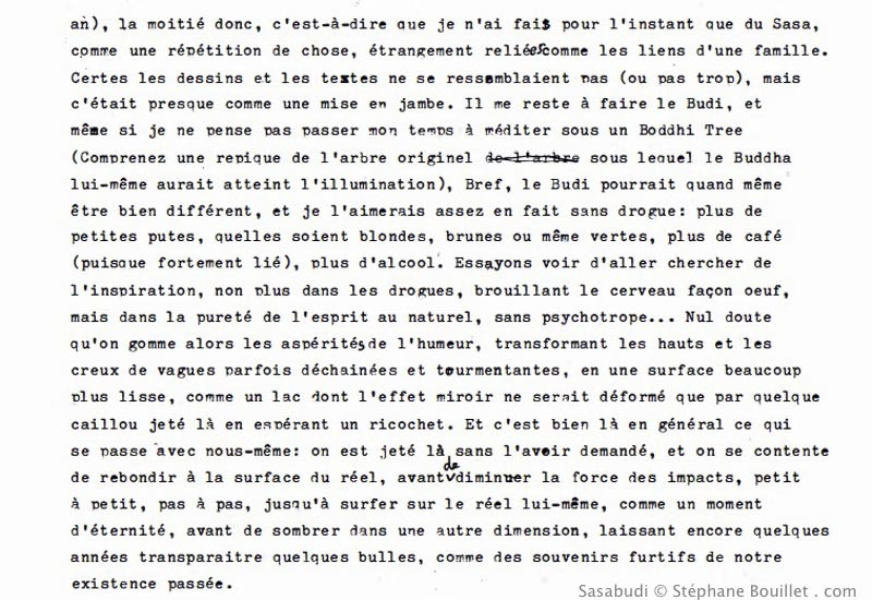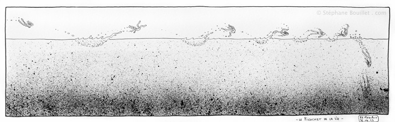 ILLUSTRATION : une femme fait des ricochet à la surface du réel, avant de sombrer dans le néant et se transformer en squelette. TEXTE : 6 mois. Enfin un peu plus même. 6 mois que ça pousse, que je me prends en photo tous les jours, et un peu moins que j'illustre, que dis-je, que j'illumine mes textes d'illustrations tout simplement splendides. Non sans déconner, j'ai laissé passer la date fatidique du 21 mars sans broncher, et c'est bien que l'expérience m'a envahi, et je ne fais plus qu'un avec elle. Même si la photo en autoportrait est devenue une pure banalité routinière, et que ces portraits prendront tout leur sens à 365 jours dans la vidéo en stop motion, le reste m'a littéralement envahi. Adsorbé,comme un abordage pirate qui se déroulerait sous nos yeux. Puis absorbé. Dans une espèce de grand Schlop. Mais faisons un peu le point : si j'ai fait la moitié de Sasabudi (puisque, en tous les cas pour le coté pileux, je ne compte pas aller plus loin qu'un an), la moitié donc, c'est-à-dire que je n'ai fais pour l'instant que du Sasa, comme une répétition de chose, étrangement reliée comme les liens d'une famille. Certes les dessins et les textes ne se ressemblaient pas (ou pas trop), mais c'était presque comme une mise en jambe. Il me reste à faire le Budi, et même si je ne pense pas passer mon temps à méditer sous un Boddhi Tree (comprenez une repique de l'arbre originel sous lequel le Buddha lui-même aurait atteint l'illumination), bref, le Budi pourrait quand même être bien différent, et je l'aimerais assez en fait sans drogue: plus de petites putes, quelles soient blondes, brunes ou même vertes, plus de café (puisque fortement lié), plus d'alcool. Essayons voir d'aller chercher de l'inspiration, non plus dans les drogues, brouillant le cerveau façon oeuf, mais dans la pureté de l'esprit au naturel, sans psychotrope... Nul doute qu'on gomme alors les aspérités de l'humeur, transformant les hauts et les creux de vagues pa