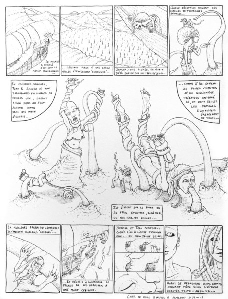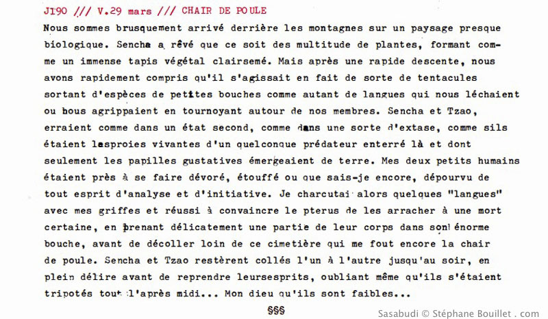 Nous sommes brusquement arrivés derrière les montagnes sur un paysage presque biologique. Sencha a rêvé que ce soit des multitude de plantes, formant comme un immense tapis végétal clairsemé. Mais après une rapide descente, nous avons vite compris qu'il s'agissait en fait de sorte de tentacules sortant d'espèces de petites bouches comme autant de langues qui nous léchaient ou nous agrippaient en tournoyant autour de nos membres. Sencha et Tzao, erraient comme dans un état second, comme dans une sorte d'extase, comme s'ils étaient les proies vivantes d'un quelconque prédateur enterré là et dont seulement les papilles gustatives émergeaient de terre. Mes deux petits humains étaient près à se faire dévorer, étouffer ou que sais-je encore, dépourvu de tout esprit d'analyse et d'initiative. Je charcutai alors quelques "langues" avec mes griffes et réussi à convaincre le pterus de les arracher à une mort certaine, en prenant délicatement une partie de leur corps dans son énorme bouche, avant de décoller loin de ce cimetière qui me fout encore la chair de poule. Sencha et Tzao restèrent collés l'un à l'autre jusqu'au soir, en plein dérire avant de reprendre leurs esprits, oubliant même qu'ils s'étaient tripotés tout l'après midi... Mon dieu qu'ils sont faibles...