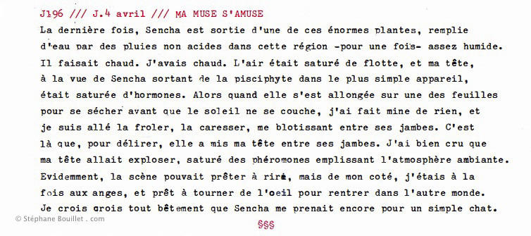 TEXTE : La dernière fois, Sencha est sortie d'une de ces énormes plantes, remplie d'eau par des pluies non acides dans cette région - pour une fois - assez humide. Il faisait chaud. J'avais chaud. L'air était saturé de flotte, et ma tête, à la vue de Sencha sortant du pisciphyte dans le plus simple appareil, était saturée d'hormones. Alors quand elle s'est allongée sur une des feuilles pour se sécher avant que le soleil ne se couche, j'ai fait mine de rien, et je suis allé la froler, la caresser, me blotissant entre ses jambes. C'est là que, pour délirer, elle a mis ma tête entre ses jambes. J'ai bien cru que ma tête allait exploser, saturée des phéromones emplissant l'atmosphère ambiante. Evidemment, la scène pouvait prêter à rire, mais de mon coté, j'étais à la fois aux anges, et prêt à tourner de l'oeil pour rentrer dans l'autre monde. Je crois tout bêtement que Sencha me prenait encore pour un simple chat.
