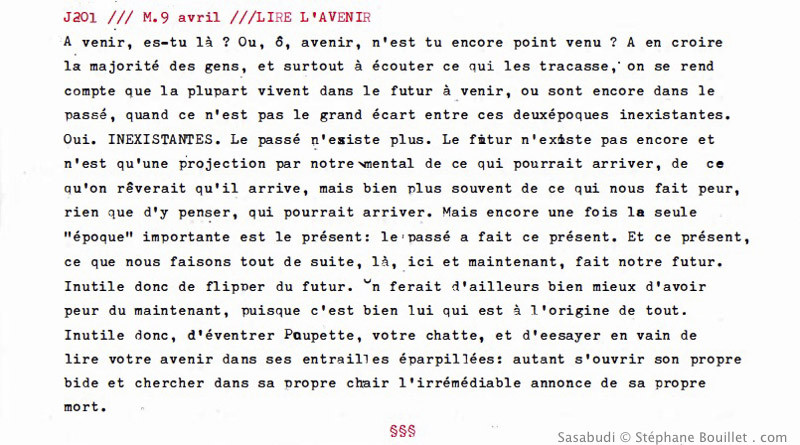 A venir, es-tu là ? Ou, ô, avenir, n'es-tu encore point venu ? À en croire la majorité des gens, et surtout à écouter ce qui les tracasse, on se rend compte que la plupart vivent dans le futur à venir, ou sont coincés dans le passé, quand ce n'est pas le grand écart entre ces deux époques inexistantes. Oui. INEXISTANTES. Le passé n'esiste plus. Le futur n'existe pas encore et n'est qu'une projection par notre mental de ce qui pourrait arriver, de ce qu'on rêverait qu'il arrive, mais bien plus souvent de ce qui nous fait peur, rien que d'y penser, qui pourrait arriver. Mais encore une fois la seule "époque" importante est le présent: le passé a fait ce présent. Et ce présent, ce que nous faisons tout de suite, là, ici et maintenant, fait notre futur. Inutile donc de flipper du futur. On ferait d'ailleurs bien mieux d'avoir peur du maintenant, puisque c'est bien lui qui est à l'origine de tout. Inutile donc, d'éventrer Poupette, votre chatte, et d'essayer en vain de lire votre avenir dans ses entrailles éparpillées: autant s'ouvrir son propre bide et chercher dans sa propre chair l'irrémédiable annonce de sa propre mort.